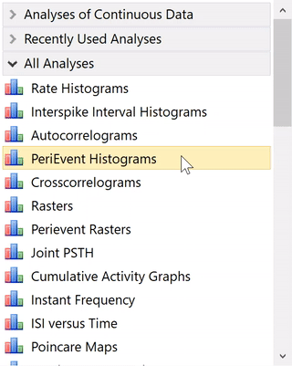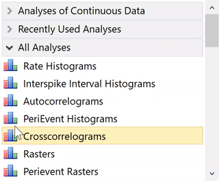 There are two ways to select an analysis in NeuroExplorer – you can click at the analysis you want to run in the Analyses Panel: