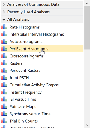 There are two ways to select an analysis in NeuroExplorer – you can click at the analysis you want to run in the Analyses Panel: